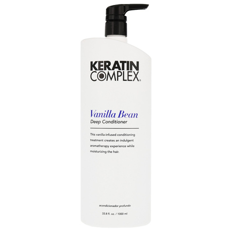 Keratin Complex's Vanilla Bean Deep Conditioner to bogata kuracja pielęgnacyjna na bazie wanilii, która zapewnia przyjemne doznania aromaterapeutyczne, jednocześnie nawilżając włosy.