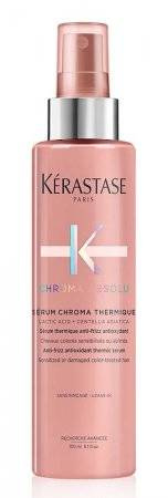 Serum termiczne do włosów koloryzowanych Kerastase Chroma Absolu chroni przed wysoką temperaturą podczas stylizacji, przeciwdziała puszeniu się włosów i działa antyoksydacyjnie. To lekkie mleczko pielęgnuje włosy koloryzowane i zapewnia im ochronę przed negatywnym wpływem czynników zewnętrznych: promieniowaniem UV, temperaturą i stresem oksydacyjnym. Włosy dzięki stosowaniu kosmetyku są bardziej miękkie, nie puszą się.