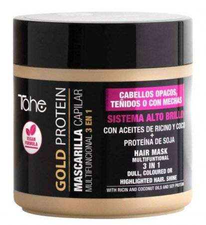 Maska do włosów farbowanych Tahe Gold Protein zapewnia intensywny kolor, niesamowity połysk i ochronę przed promieniowaniem UV. Ta wielozadaniowa maska to idealne rozwiązanie dla włosów matowych, farbowanych oraz rozjaśnionych. Włosy są wzmocnione i odbudowane, cieszą pięknym blaskiem. Maska chroni przed blaknięciem koloru. W składzie olej kokosowy i olej rycynowy. Stosuj na trzy sposoby - jako zabieg odżywczy, błyskawiczną odżywkę albo maskę.