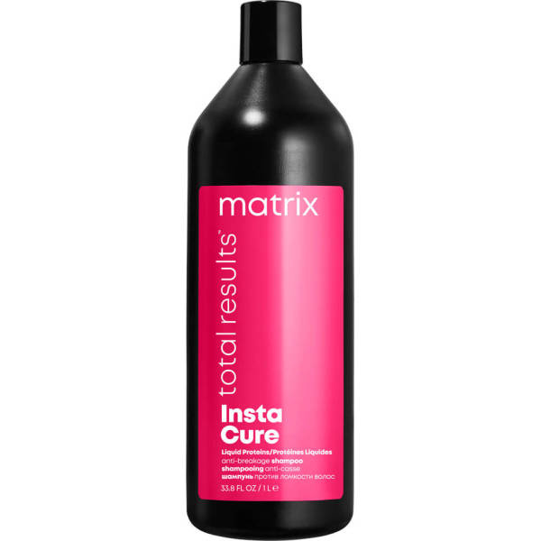 Matrix Total Results Instacure Anti-Breakage Shampoo, nasycony płynnymi proteinami, pomaga odbudować siłę, zmniejszając łamliwość włosów suchych, łamliwych i zniszczonych. System szamponu, odżywki i sprayu zapobiegający pękaniu wypełnia porowatość, tworząc równą i zrównoważoną powierzchnię.