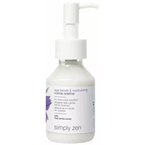 Simply Zen Age Benefit & Moisturizing Cuticule Redefiner to preparat oddziałujący szczególnie na trzon włosa. Przeciwdziała puszeniu się włosów, a także poprawia ich wygląd oraz zwiększa podatność na układanie. Preparat zawiera silikony, kwas hialuronowy, nawilżające składniki aktywne, proteiny, filtr UV oraz starannie dobrane aktywne składniki roślinne o właściwościach : nawilżających, kondycjonujących, ochronnych oraz antyoksydacyjnych.