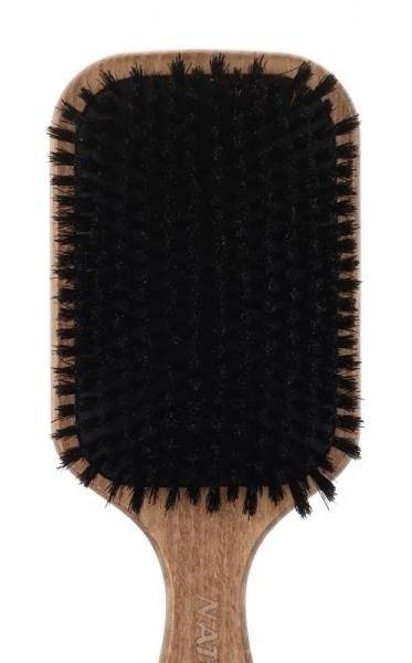 Produkt został wykonany z naturalnego drewna. Wyprofilowana rękojeść idealnie dopasowuje się do kształtu dłoni. Zapewnia wygodę oraz komfort podczas użytkowania. Powierzchnia czesząca posiada gęste, lekko elastyczne kępki szczeciny o różnej długości. Zostały wykonane z naturalnego włosia dzika, umieszczonego na czarnej, pneumatycznej poduszce. Pozwala na dokładne rozczesywanie zarówno długich, jak i krótkich włosów. Produkt wykonano z ogromną starannością i dbałością o detale, dzięki czemu pozwala na długoletnie użytkowanie. Na rękojeści umieszczono logo i nazwę producenta.