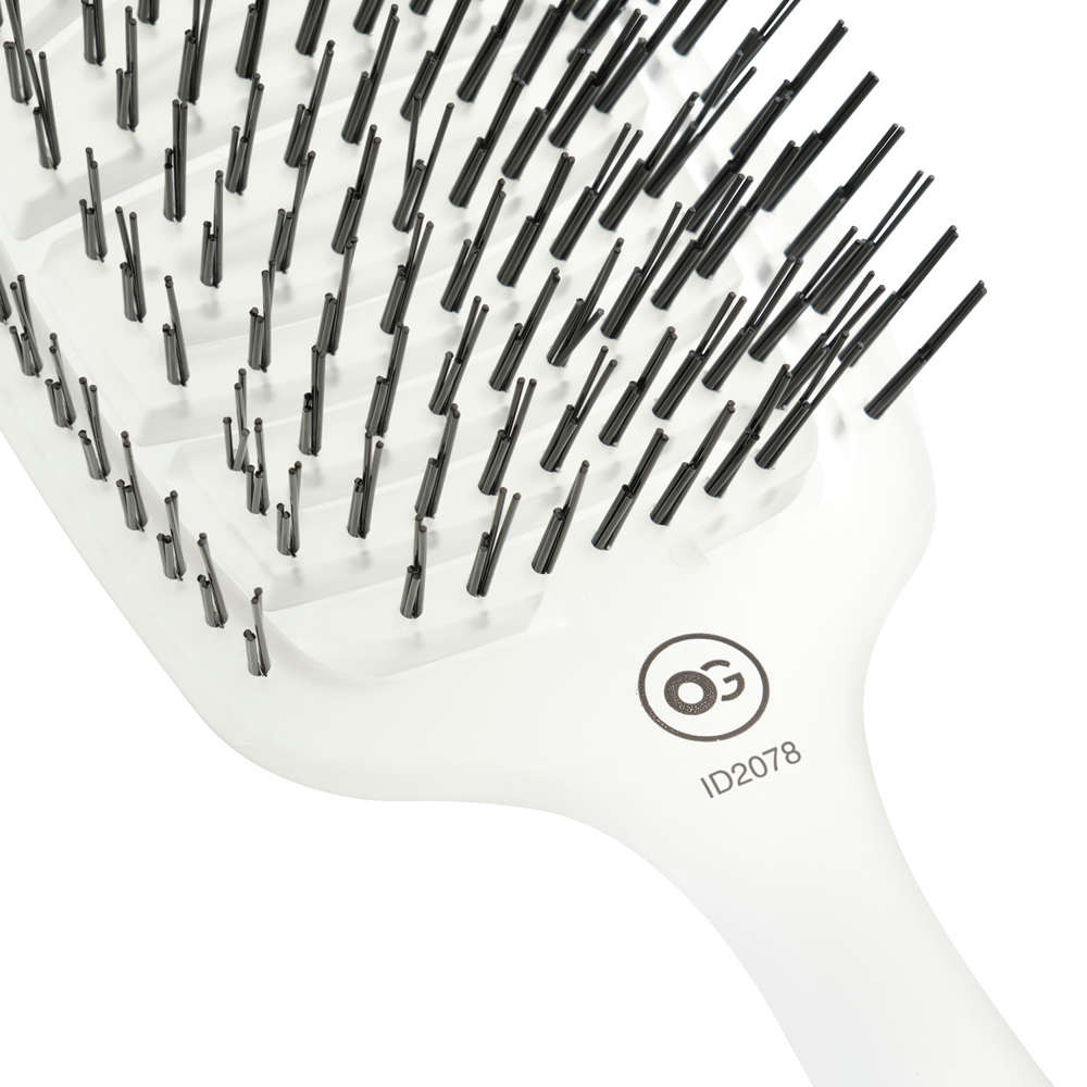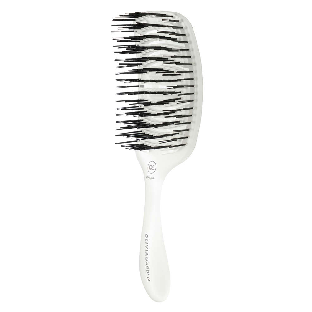 Szczotka Olivia Garden przeznaczona jest do rozczesywania włosów cienkich. Szczotka nie ciągnie włosów oraz ich nie wyrywa. Elastyczna, wentylowana konstrukcja równomiernie rozprowadza nacisk podczas szczotkowania włosów. Ze względu na wyjątkowy kształt dostosowuje napięcie w zależności od rodzaju włosów i skóry głowy. Podwójne włosie gwarantuje dokładne rozczesanie włosów w kilka chwil. W korpusie znajdują się duże otwory, który ułatwiają przepływ powietrza oraz zapewniają szybsze suszenie. Co ważne, szczotka jest bardzo lekka, dzięki temu nie obciąża nadgarstka w trakcie stylizacji.