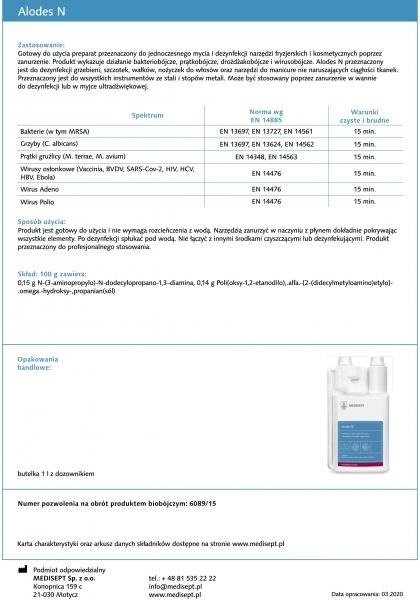 Alodes N to gotowy do użycia preparat przeznaczony do jednoczesnego mycia i dezynfekcji narzędzi fryzjerskich i kosmetycznych poprzez zanurzenie. Produkt wykazuje działanie bakteriobójcze, prątkobójcze, drożdżakobójcze i wirusobójcze. Alodes N przeznaczony jest do dezynfekcji grzebieni, szczotek, wałków, nożyczek do włosów oraz narzędzi do manicure nie naruszających ciągłości tkanek. Przeznaczony jest do wszystkich instrumentów ze stali i stopów metali.