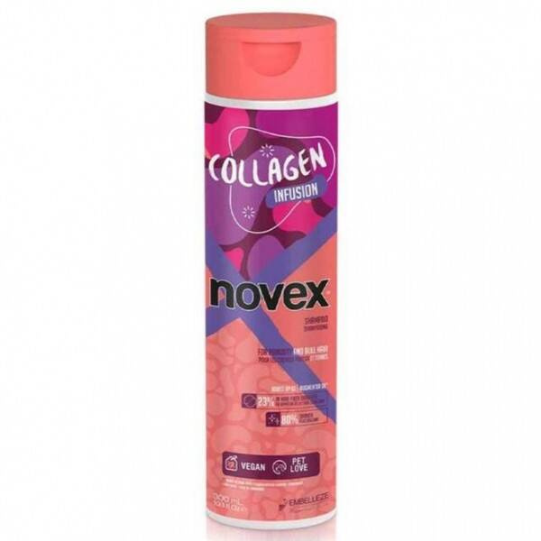 Szampon Novex Collagen Infusion zapewnia włosom delikatne oczyszczenie, wzmocnienie mieszków włosowych, wspomaganie wzrostu i zagęszczenie cienkich i słabych włosów.