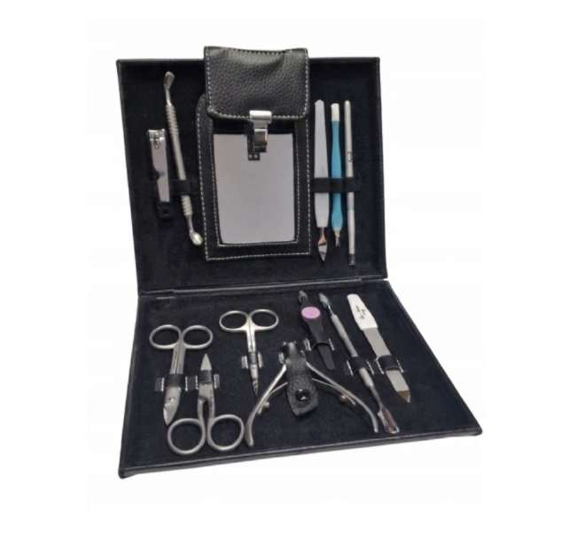 Wyjątkowy i elegancki zestaw do pielęgnacji paznokci prezentuje się w czarnej skórze , dodając luksusu i stylu.