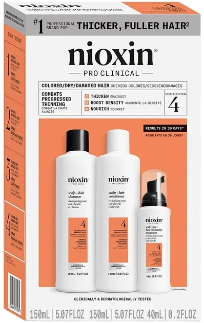 Dzięki innowacyjnej technologii, Nioxin zapewnia wyjątkową jakość, która gwarantuje widoczne efekty już po pierwszym użyciu. Zestaw Nioxin System 4 to idealne rozwiązanie dla osób z włosami farbowanymi i przerzedzającymi się. Produkt ten wzmacnia strukturę włosów, chroni je przed łamaniem i przywraca im naturalny blask.