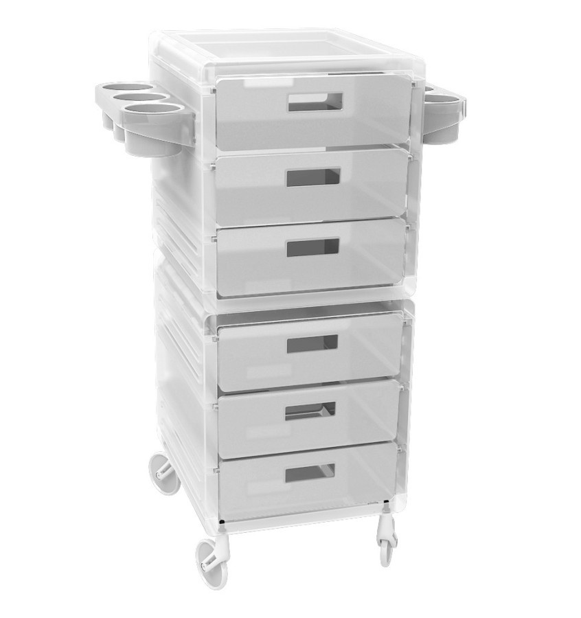 Wózek wykonany jest z wysokiej jakości tworzywa co zapewni długą żywotność produktu. Wyposażony jest w 6 szuflad, dwa uchwyty na suszarkę oraz umieszczone po bokach cztery kubki. Szuflady są zabudowane co przeciwdziała dostawaniu się do środka włosów. Wózek jest wyposażony w nowoczesne kółka NO-HAIR Wheels, które są odporne na zabrudzenia i posiadają system zapobiegający wkręcaniu się włosów w łożyska kółek.