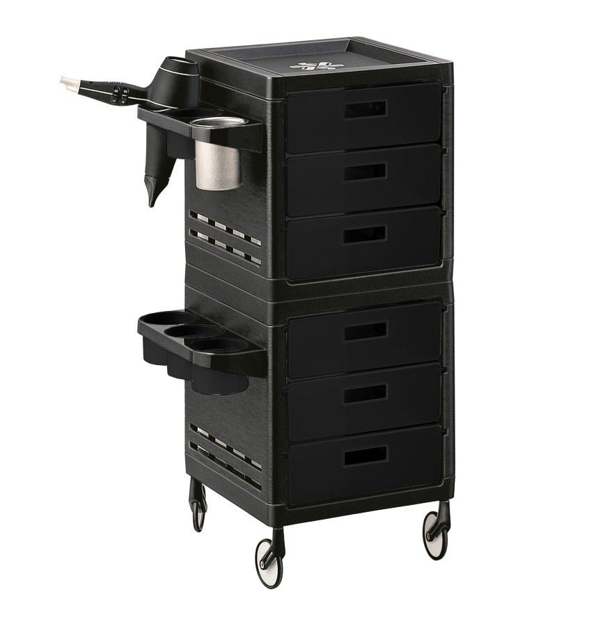 Wózek wykonany jest z wysokiej jakości tworzywa co zapewni długą żywotność produktu. Wyposażony jest w 6 szuflad, dwa uchwyty na suszarkę oraz umieszczone po bokach cztery kubki. Szuflady są zabudowane co przeciwdziała dostawaniu się do środka włosów. Wózek jest wyposażony w nowoczesne kółka NO-HAIR Wheels, które są odporne na zabrudzenia i posiadają system zapobiegający wkręcaniu się włosów w łożyska kółek.