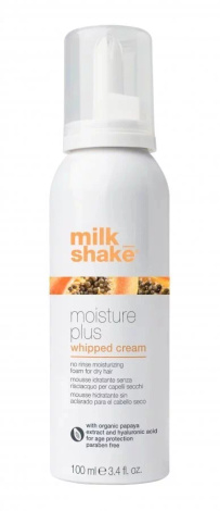 Milk Shake Moisture Plus Whipped Cream oparty jest na bazie organicznych ekstraktów z papai, na wysokim stężeniu kwasu hialuronowego, który wykazuje intensywne działanie nawilżające oraz ekstrakcie z jagód Goji,  proteinach mleka, proteinach komosy ryżowej, ekstrakcie z truskawek, ekstrakcie  z nasion słonecznika. Nawilża, chroni kolor, wykazuje działanie przeciwstarzeniowe.