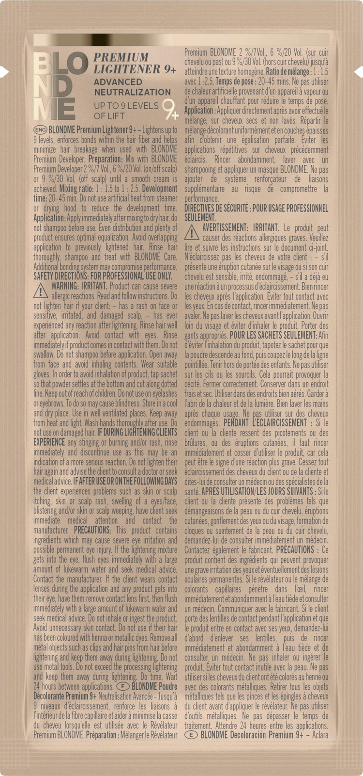 Rozjaśniacz Schwarzkopf Blond Me Premium Lift 9+to niepylący puder pozwalający na rozjaśnienie włosów aż o 9 tonów, który dzięki zawartości specjalnie opracowanych składników neutralizujących Anti Yellow Agents zapewnia zaawansowane tonowanie niepożądanych, żółtych refleksów. Elastyczne proporcje mieszania pozwalają na osiągnięcie idealnej konsystencji oraz optymalnych wyników dekoloryzacji. Dzięki pozbawionej amoniaku formule wzbogaconej dodatkowo o białka pszenicy, rozjaśniacz gwarantuje delikatne i kontrolowane rozjaśnianie włosów, przy zachowaniu optymalnej dbałości o dobrą kondycję włosów. Po zmieszaniu z ekskluzywnym oksydantem BlondMe Blond Developer uzyskujemy kremową konsystencję, która gwarantuje bezpieczne, skuteczne i przyjemne rozjaśnienie.