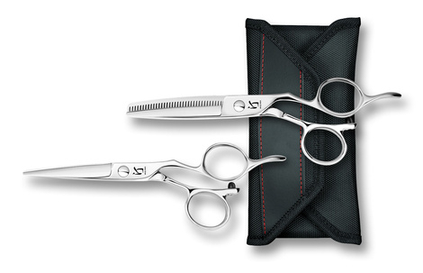 Zestaw Migiwa składający się z nożyczek offsetowych (MGW-55 OS lub MGW-60 OS) wraz z degażówkami offsetowymi 6.0 cala w eleganckim etui na dwie pary.
