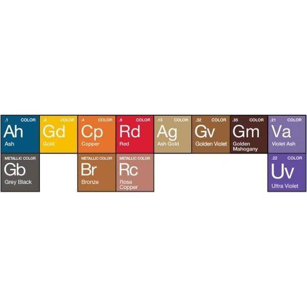 - Gm – Golden Mahogany .35 (Złoto-Miedziany) – Wspaniały do nadania blasku i wyciągnięcia złotych refleksów z brązów, do nadania głębi ciemnym brązom