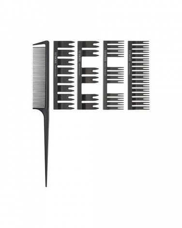 Zestaw Lussoni DC 500 składa się z grzebienia ze szpikulcem i 4 nakładek przeznaczonych do wykonywania balejażu i pasemek. Grzebień został zaprojektowany, by ułatwić wydzielanie pasemek i przedziałków na włosach. Wąsko rozstawione, drobne ząbki dokładnie rozczesują pasma włosów, a wymienne nakładki ułatwiają wydzielanie pasemek podczas koloryzacji. Szpikulec jest idealny do unoszenia wybranych partii włosów i pozwala dokładnie oddzielić pasma od siebie.